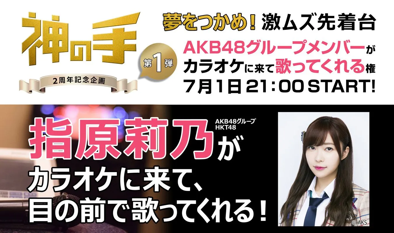 「神の手」は、配信開始2周年を記念した特別企画「夢を掴め!激ムズ先着台」の第1弾、7月1日からスタートするAKB48グループのメンバーがカラオケボックスに来てあなたのために1曲歌ってくれる権の参加メンバーが、AKB48グループ 選抜総選挙で3連覇を果たし、不動の人気NO.1メンバーとなっている指原莉乃さんに決定いたしました!カラオケボックスの1室で、指原さんがあなたのために目の前で歌ってくれます!また、獲得された方は自分以外に10名様までお連れ様を同席させることができる特典付きです。ぜひ、チャレンジしてください!なお、当企画では、カラオケボックス3部屋をご用意しており、1部屋ごとに期間を分けて3回開催し、各回先着で獲得した1名ずつ、合計3名様だけが獲得できる貴重な権利をご提供いたします。獲得できなかった方には、もれなく当企画専用台で使用されたポイントすべてを返還いたしますので、1回で諦めずにチャレンジしてください!