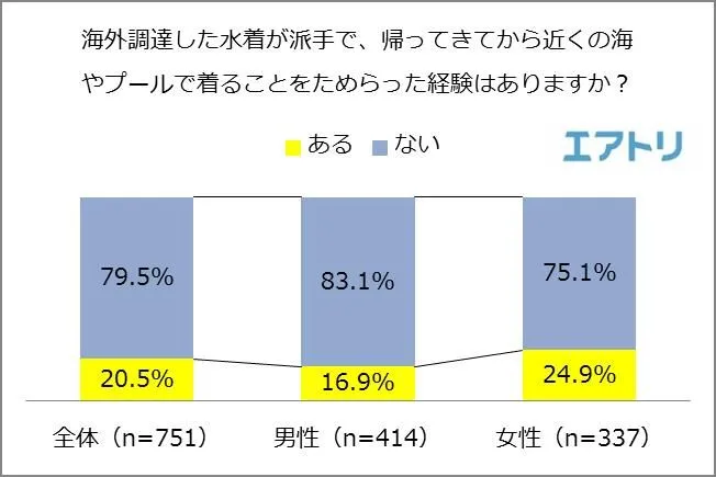 「現地調達した水着が派手で、帰ってきてから近くの海やプールで着ることをためらった経験はありますか?」と聞いたところ、全体では20.5%が「ある」と回答し、5人に1人が経験者であることが分かりました。男女別では「ある」と回答した男性は16.9%だったのに対し、女性は4人に1人となる24.9%となりました。女性の方がより海外での水着の衝動買いには気を付けた方が良さそうです。