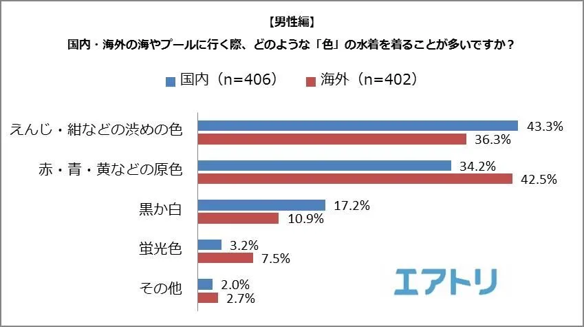 国内・海外で着る水着の“色”に違いがあるかどうかを調べたところ、男性の場合は国内では「渋めの色」(国内:43.3%、海外:36.3%)が一番人気だったのに対し、海外では「原色」(国内:34.2%、海外:42.5%)が1位となりました。「蛍光色」も国内では3.2%に留まったのに対し、海外は7.5%に伸びており、海外では派手目な色が人気であることが分かりました。