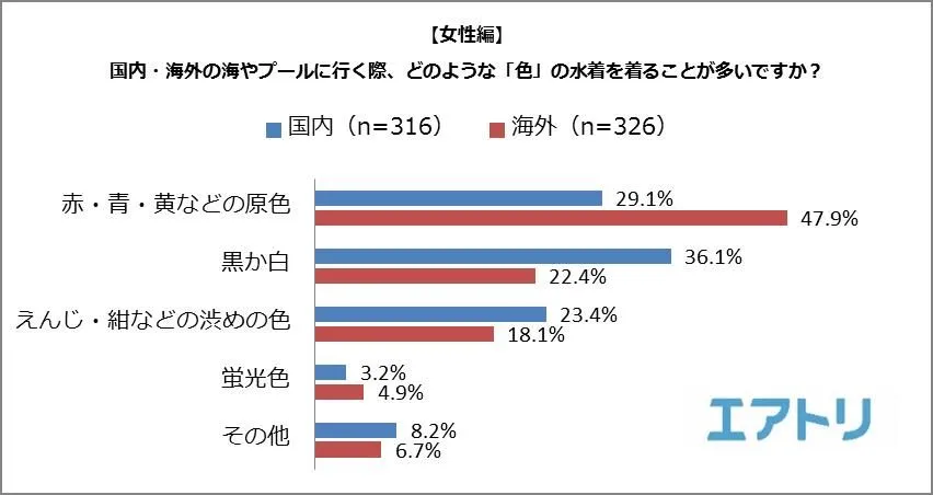 一方、女性の場合、国内での一番人気は「黒か白」(国内:36.1%、海外:22.4%)でしたが、海外ではダントツで「原色」(国内:29.1%、海外:47.9%)となり、こちらも海外では明るい色が選ばれることが分かりました。
