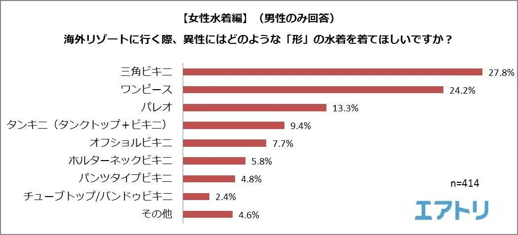 一方、男性は「三角ビキニ」(27.8%)と「ワンピース」(24.2%)と露出の多いものと少ないものが1・2位になり、好みが分かれる結果となりました。
