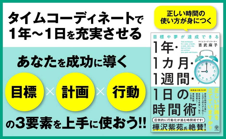 株式会社かんき出版(本社:千代田区 代表取締役社長:齊藤龍男)は、『目標や夢が達成できる 1 年・1 カ月・1週間・1 日の時間術』(吉武 麻子/著)https://kanki-pub.co.jp/pub/book/details/9784761276942を2023年10月4日より全国の書店・オンライン書店等(一部除く)で発売いたします。