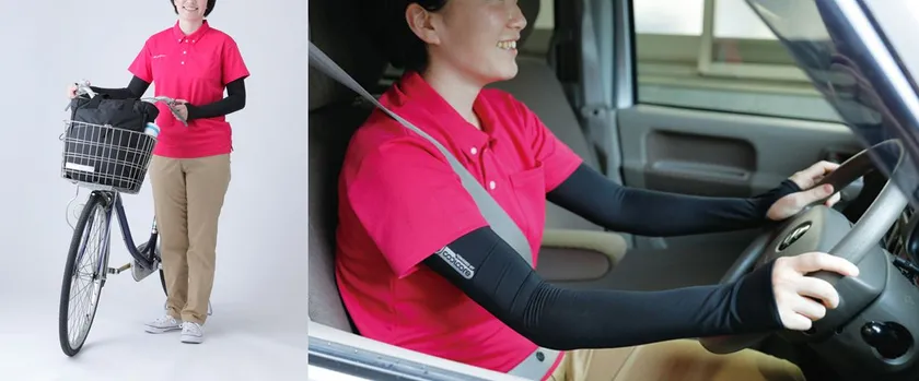 都内では“自転車移動が多い”との声を参考に、手の甲まで紫外線をブロックできるよう、長めのサイズに設計し指穴をつけました。長くすることで二の腕までカバーでき、広い範囲でより冷感効果を体感できます。また男女兼用サイズを実現させるため、ストレッチ効果のある素材を選定し、どんな方にもフィットする仕様にこだわりました。現在の介護ユニフォームはカラフルなデザインが増えており、ユニフォームカラーの邪魔をしない色として、合わせやすいブラックを採用しています。