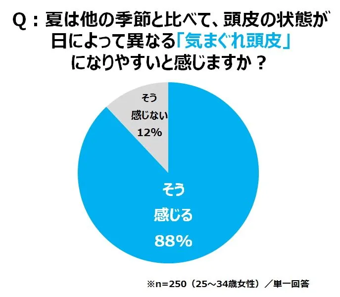 それでは、当事者である女性たちは、こうした夏の“頭皮異常”を自覚しているのでしょうか。アラサー女性たちに、「夏に頭皮の悩み・トラブルを感じたことがありますか?」と聞いたところ、実に72%が「ある」と回答。さらに、「夏は他の季節と比べて、頭皮の状態が日によって異なる“気まぐれ頭皮”になりやすいと感じますか?」という質問では、88%と約9割が「そう感じる」と答えました。