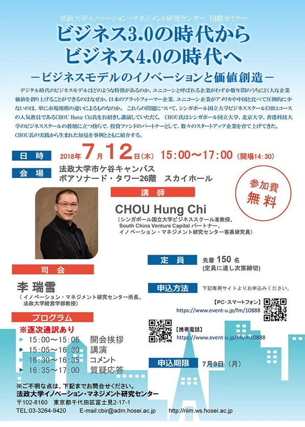 法政大学イノベーション・マネジメント研究センター 国際セミナー「ビジネス3.0の時代からビジネス4.0の時代へ -ビジネスモデルのイノベーションと価値創造-」 7/12(木)市ケ谷キャンパスで開催