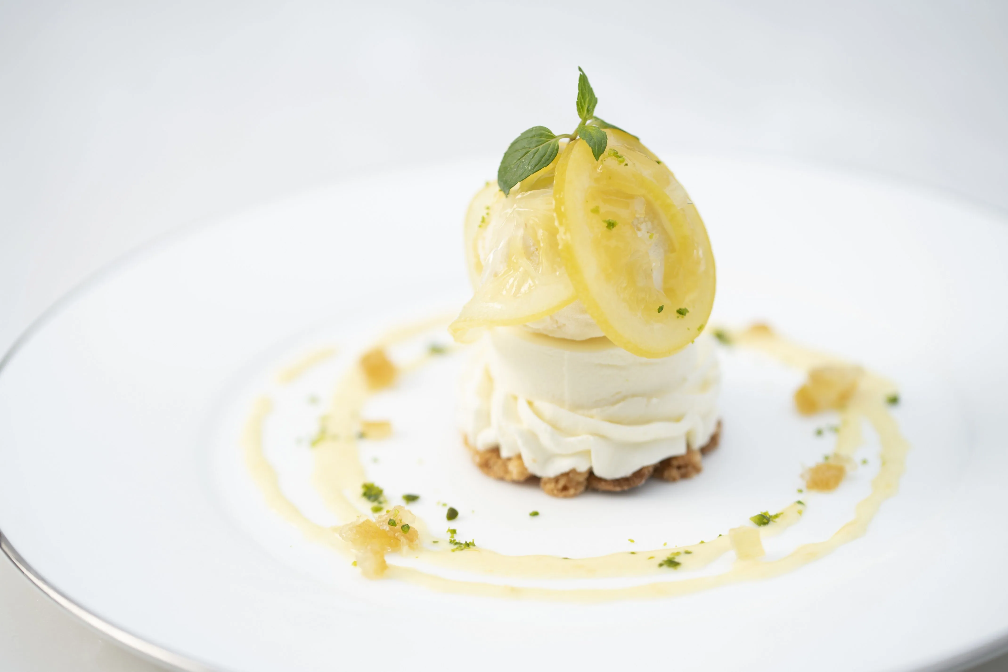 サクサクとした生地にヨーグルトムースとバニラアイスを合わせたレモンタルト。輪切りのレモンを添えて、甘すぎずさっぱりとした口当りに仕上げました。
