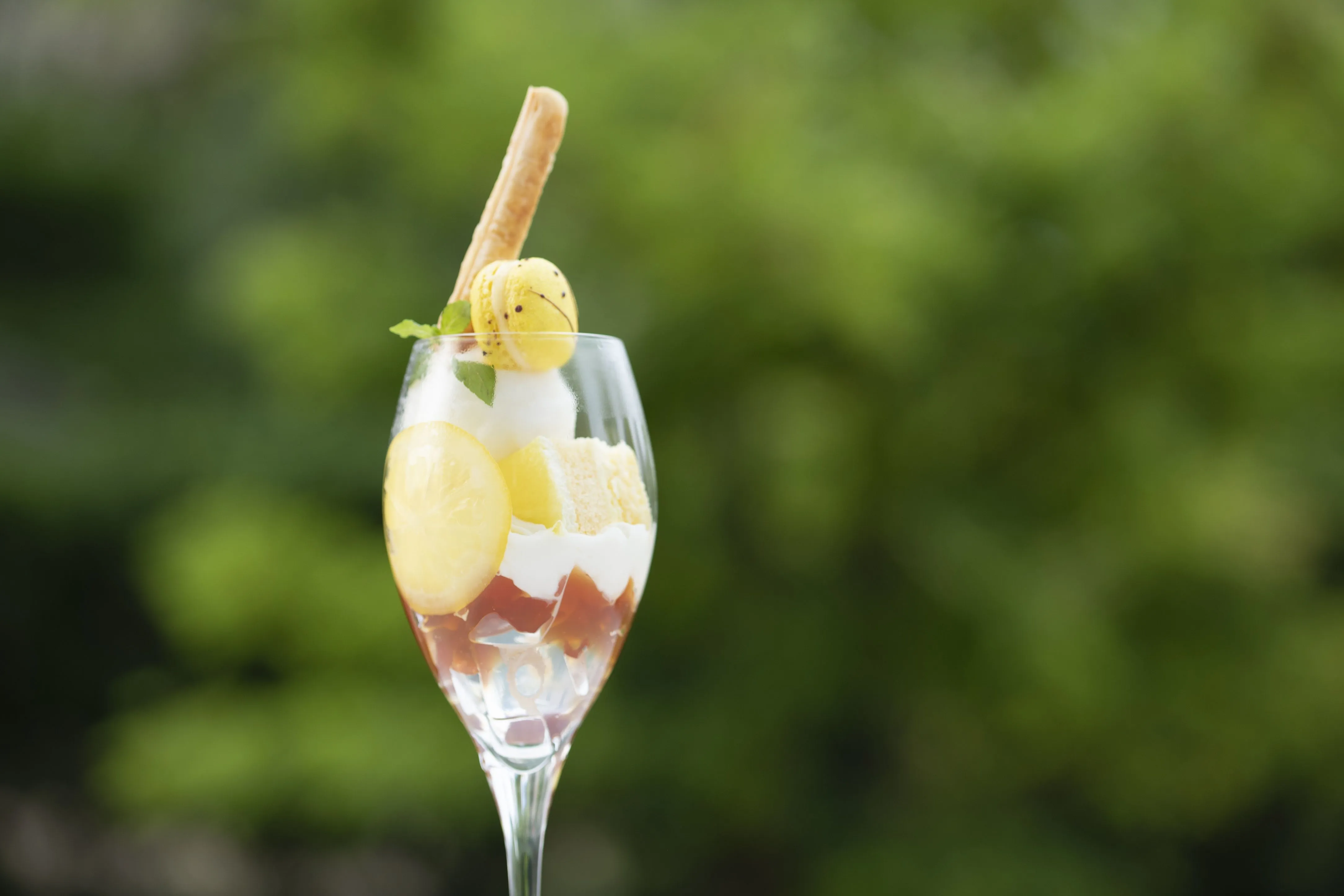 グラスの中には蜂蜜漬けにしたレモンにマカロンとさっぱりとしたシャーベット、アクセントには紅茶ゼリーをトッピングしました。夏の暑い日に食べたくなる爽やかなパフェに仕上げました。