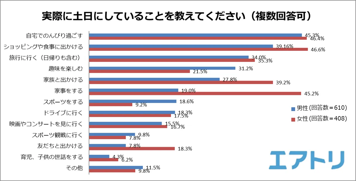 オンライン総合旅行サービス「エアトリ」(https://www.skygate.co.jp)を運営する株式会社エアトリ(本社:東京都新宿区、代表取締役社長:吉村 英毅)は、10代~70代の結婚している男女1018名を対象に「夫婦の土日の過ごし方」に関する調査を実施しました。