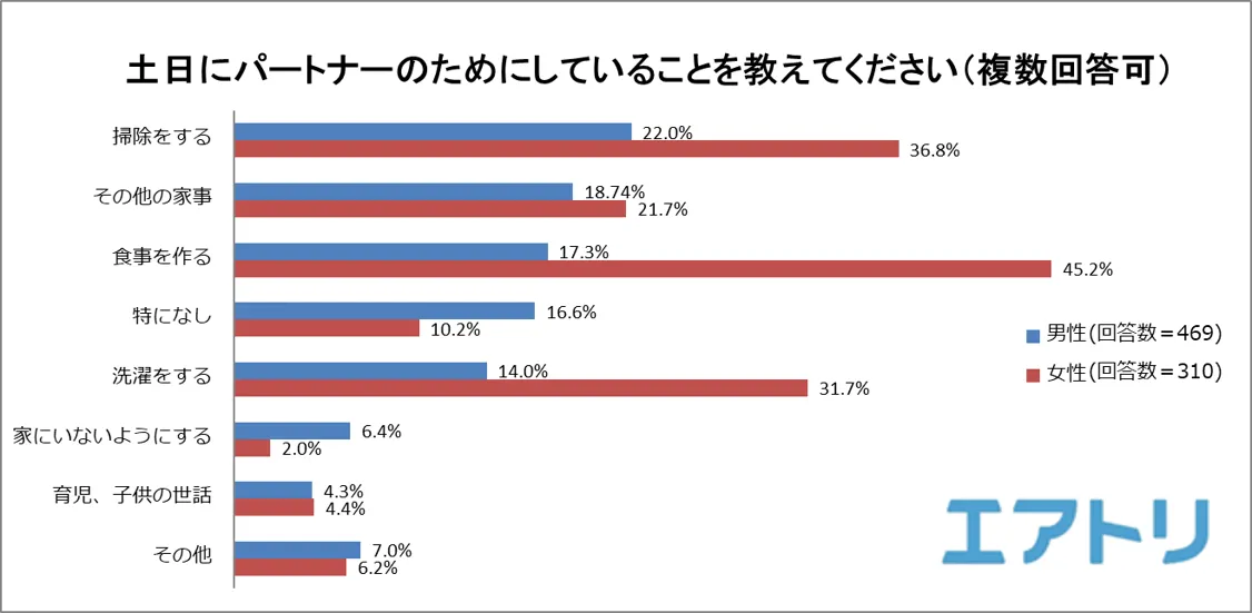 仕事をしている人に、土日にパートナーのためにしていることを聞いたところ、女性がパートナーのためにしていること1位は「食事を作る」(45.2%)でした。一方で男性は17.3%と、女性より大きく下回る結果となりました。その他にも、「掃除をする」(女性36.8%、男性22.0%)、「洗濯をする」(女性31.7%、男性14.0%)など、家事に関する項目を回答した女性の割合が男性の割合を上回る結果となりました。また、6.2%の男性がパートナーのために「家にいないようにする」と回答しました。