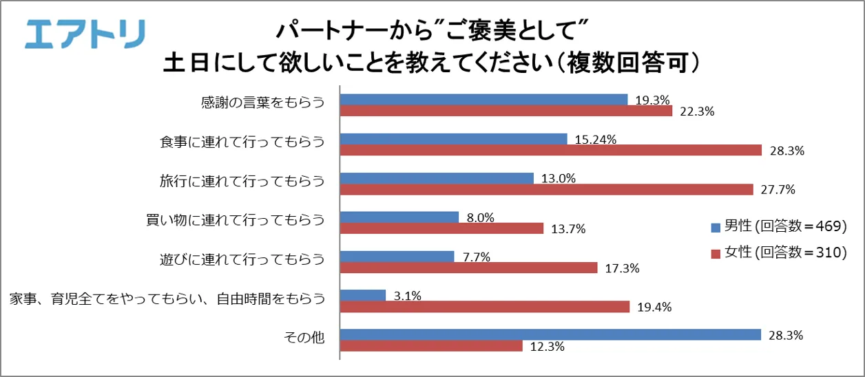 仕事をしている人に、パートナーから”ご褒美として”土日にして欲しいことを聞いたところ、女性がパートナーにして欲しいご褒美の上位2つは「食事に連れて行ってもらう」(28.3%)、「旅行に連れて行ってもらう」(27.7%)となり、外に連れ出してほしいと思っている女性が多いようです。男性の上位2つは「感謝の言葉をもらう」(19.3%)、「食事に連れて行ってもらう」(15.2%)でした。