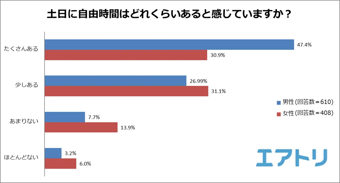 土日に自由時間がどれくらいあるのかを聞いたこところ、「たくさんある」と回答した男性が47.4%であるのに対し、女性は30.9%と、男性のほうが女性よりも自由時間が多いと感じていることが明らかになりました。実際に土日にしていることを聞いたところ、家事をする女性が多いという結果からも、女性は男性よりも自由時間が少ないと感じていることが分かります。