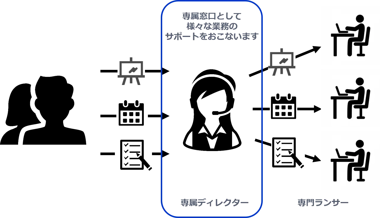 ・専属ディレクターが一括対応。依頼内容に応じてメンバースキルをマッチング、オンラインチームを構築します。