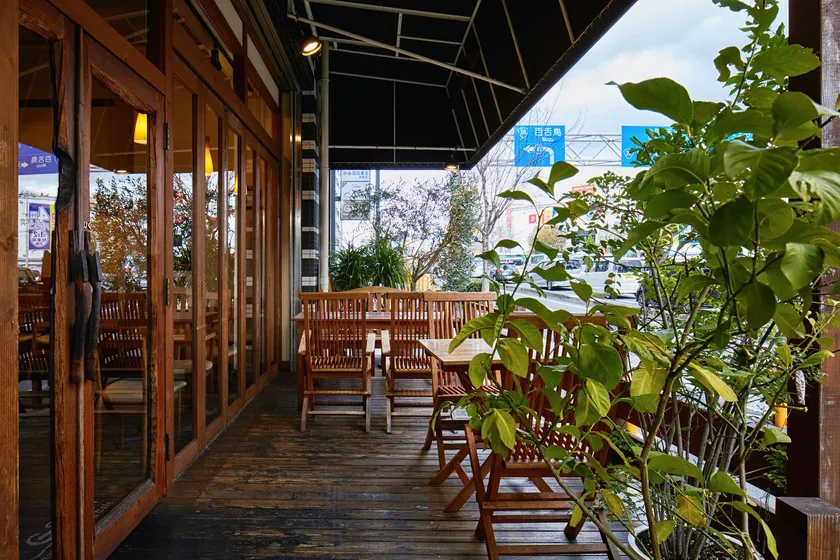外には開放的なテラス席のあるウッドデッキ