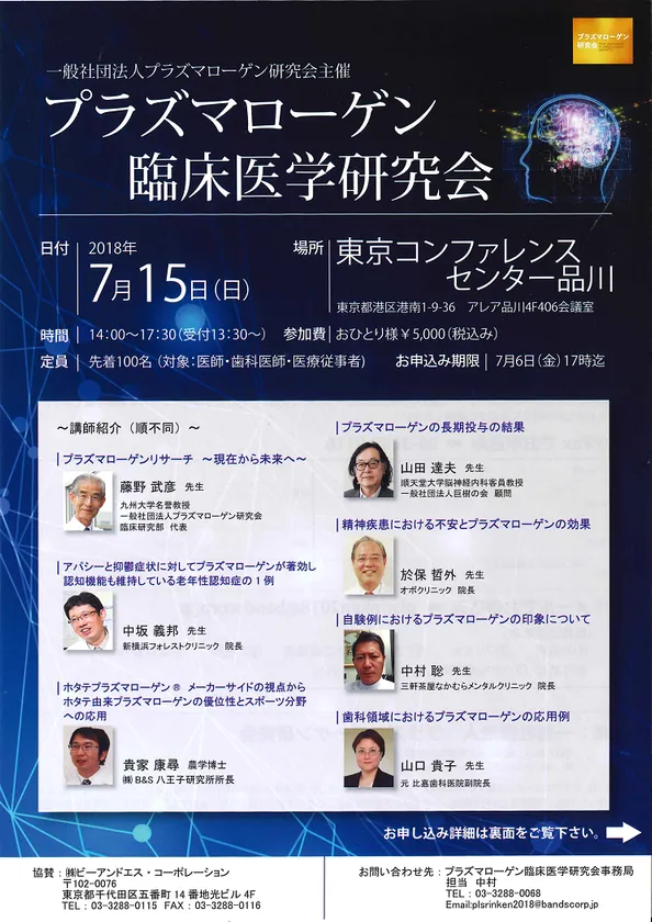 株式会社ビーアンドエス・コーポレーションは、この活動に賛同し、ホタテプラズマローゲン(R)も共同開発したことから、このたび「プラズマローゲン臨床医学研究会」に協賛する運びとなりました。