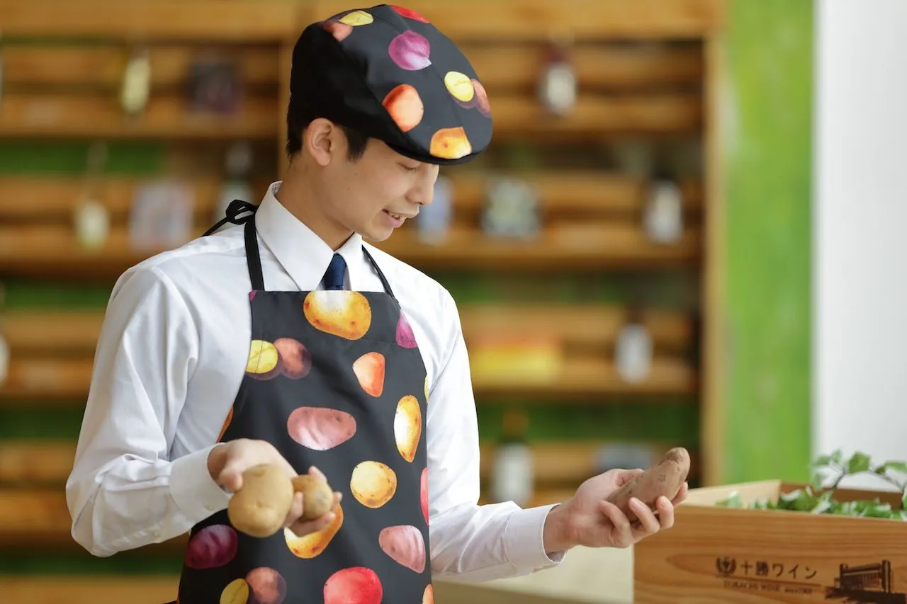 北海道のじゃがいもをこよなく愛する、当イベントの主催者「じゃが店長」が、じゃがいもの美味しい食べ方や、味わいの違いなどの「じゃが知識」を伝授します。じゃが店長はじゃがいもを愛するあまり、多種多様でカラフルなじゃがいもが描かれたオリジナルのエプロンと、ハンチング帽を身につけています。