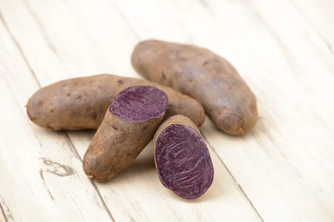 皮、中身ともに紫色で、加熱すると出る鮮やかな青みが特徴です。特に色が鮮やかになる、ポテトチップスにして提供します。