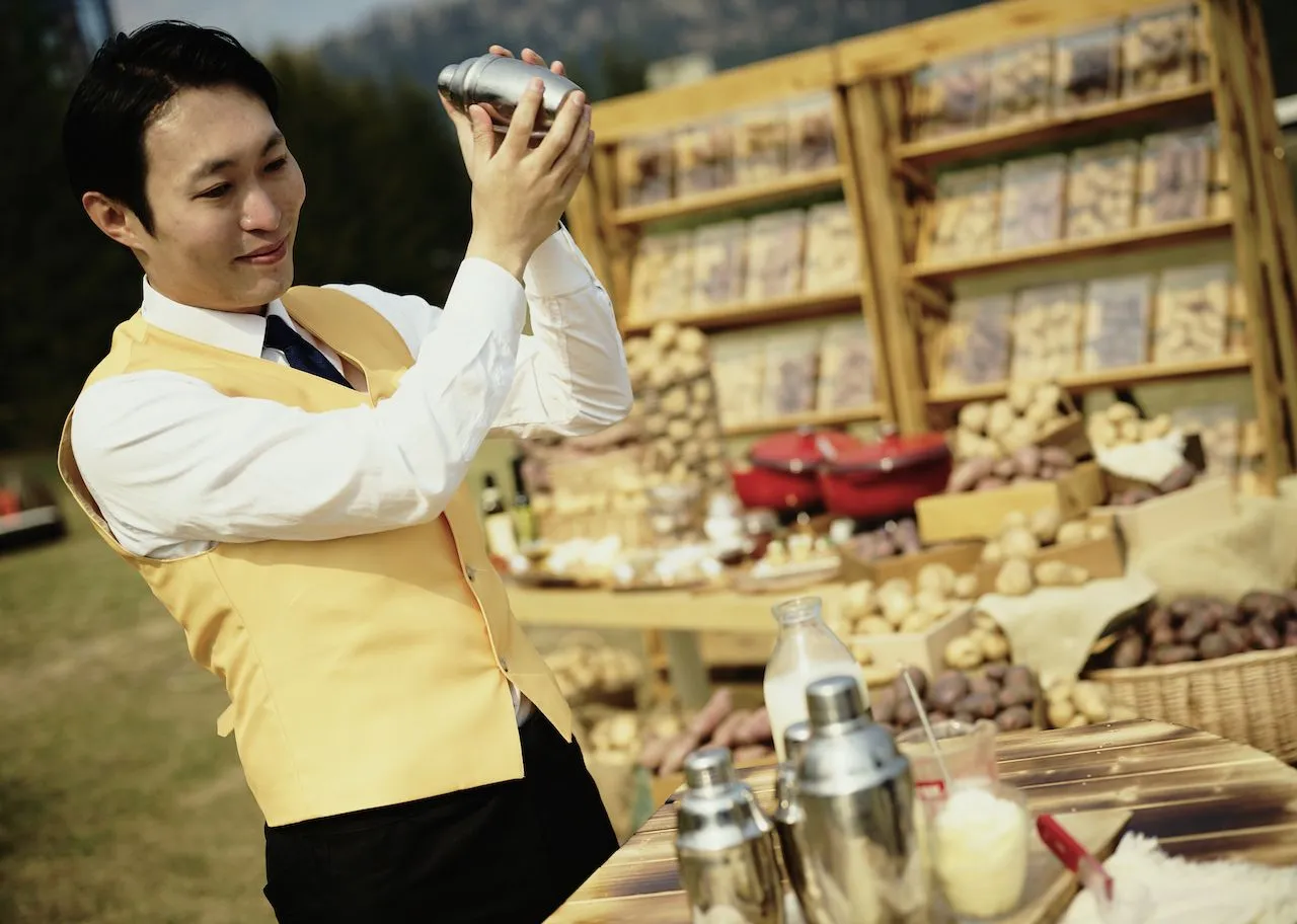 じゃがバタカウンターでは自分でバターを作り、じゃがバターにすることができます。そして、バター作りは「バタテンダー」というスタッフがサポートするため、初めてバターを作る方でも安心です。バタテンダーと名付けた理由は、生クリームと塩を混ぜて振るバター作りの工程と、リキュールなどを混ぜて振るカクテル作りの工程が似ているためです。