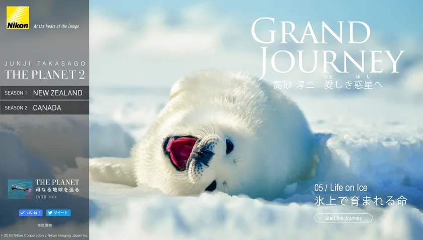 全12回にわたってお届けする「THE PLANET 2」第5回のテーマは「Life on Ice 氷上で育まれる命」です。ニコンデジタル一眼レフカメラ「D850」を用いて、カナダのセントローレンス湾に浮かぶ流氷の上で生まれたばかりのタテゴトアザラシの赤ちゃんの可愛らしい姿を主に撮影しています。写真集をめくるようなイメージで、ニコンのテクノロジーと高砂氏の豊かな感性が融合した作品によるストーリーをお楽しみいただけます。