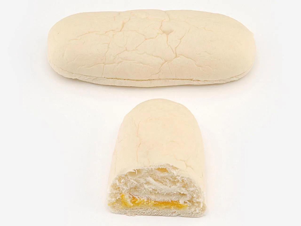 白い生地のコッペパンに、マンゴークリームとホイップクリームをサンドしました。