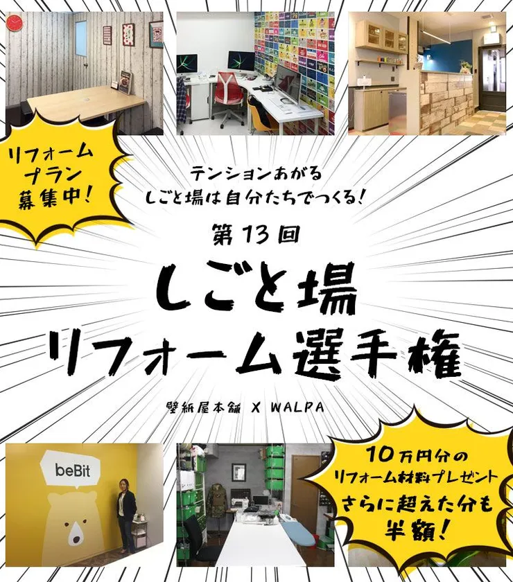 株式会社フィル(所在地:大阪府大阪市、代表取締役:濱本 廣一)が運営するセルフリフォーム材料のインターネットショップ「壁紙屋本舗」と、輸入壁紙専門店「WALPA」は、毎日テンションがあがるしごと場を、社員・スタッフみんなで作り上げる『第13回 しごと場リフォーム選手権』を共同開催いたします。