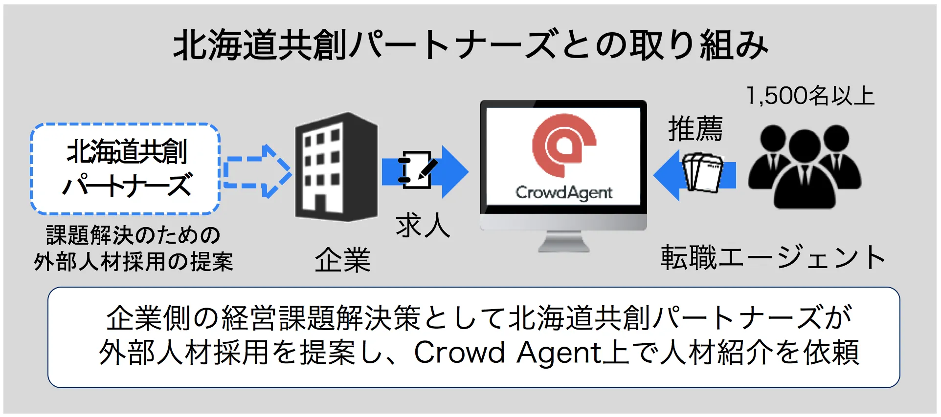 人材確保という北海道企業の課題の解決のため、都市部転職エージェント1,500名以上が利用するCrowdAgentを活用し、当社の人材ソリューションの活用による地域経済活性化に向けた新たな取り組みとなります。