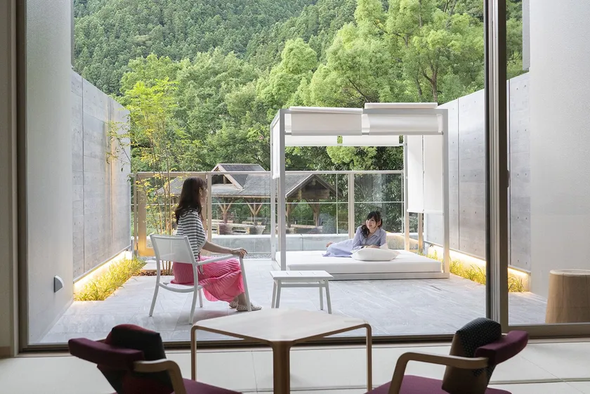 部屋とほぼ同じ広さのアウトドアリビングは部屋ごとにハンモックや、木陰のベンチなど、設えが異なります。ガラス越しには庭園と、川沿いの森が望めます。