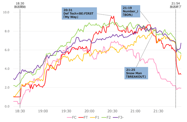 それ以外にも、FT層は20:31に最高となる9.6%を記録しています。その時間帯はDef Tech×BE:FIRSTの「My Way」が放送されていました。