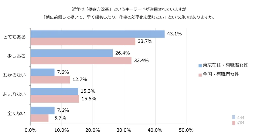 質問:近年は「働き方改革」というキーワードが注目されていますが、「朝に前倒しで働いて、早く帰宅をしたり、仕事の効率化を図りたい」という想いはありますか。