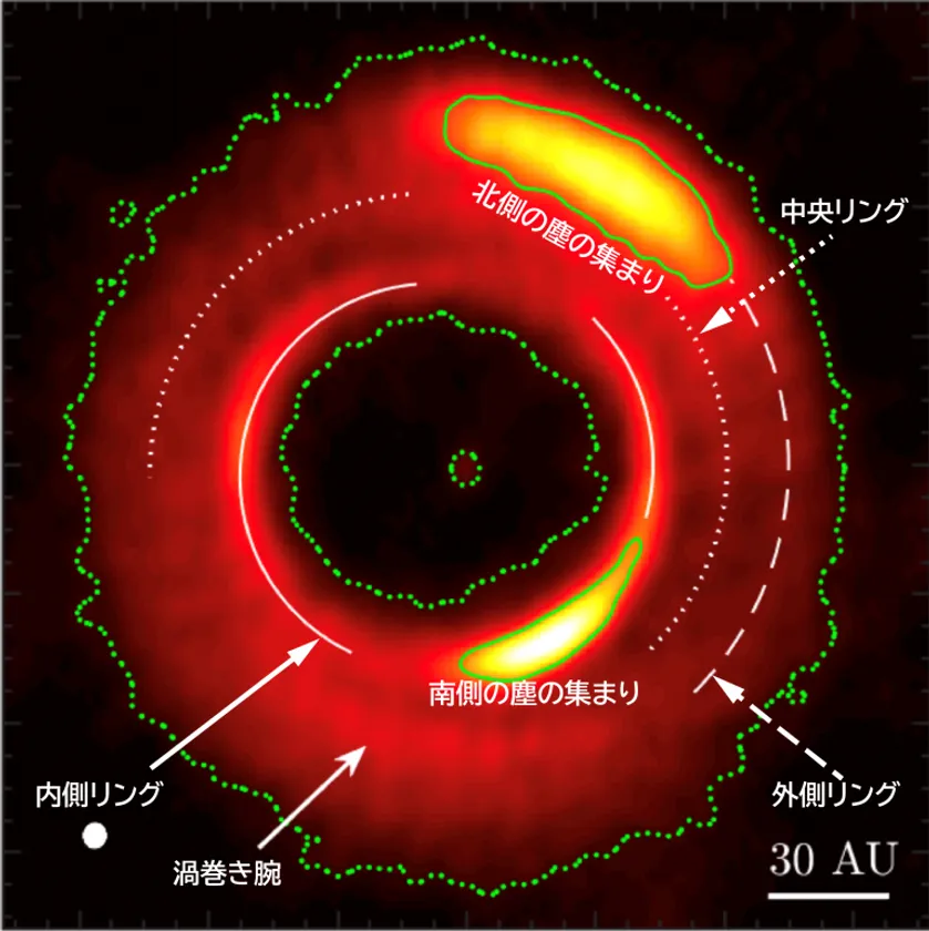 アルマ望遠鏡が波長0.87mmのサブミリ波で観測した、若い星MWC 758のまわりの円盤。中心部には大きな楕円形の穴が開いており、その外側の円盤には3重のリングと2か所の塵のあつまり、渦巻き腕などいろいろな構造が写し出されています。