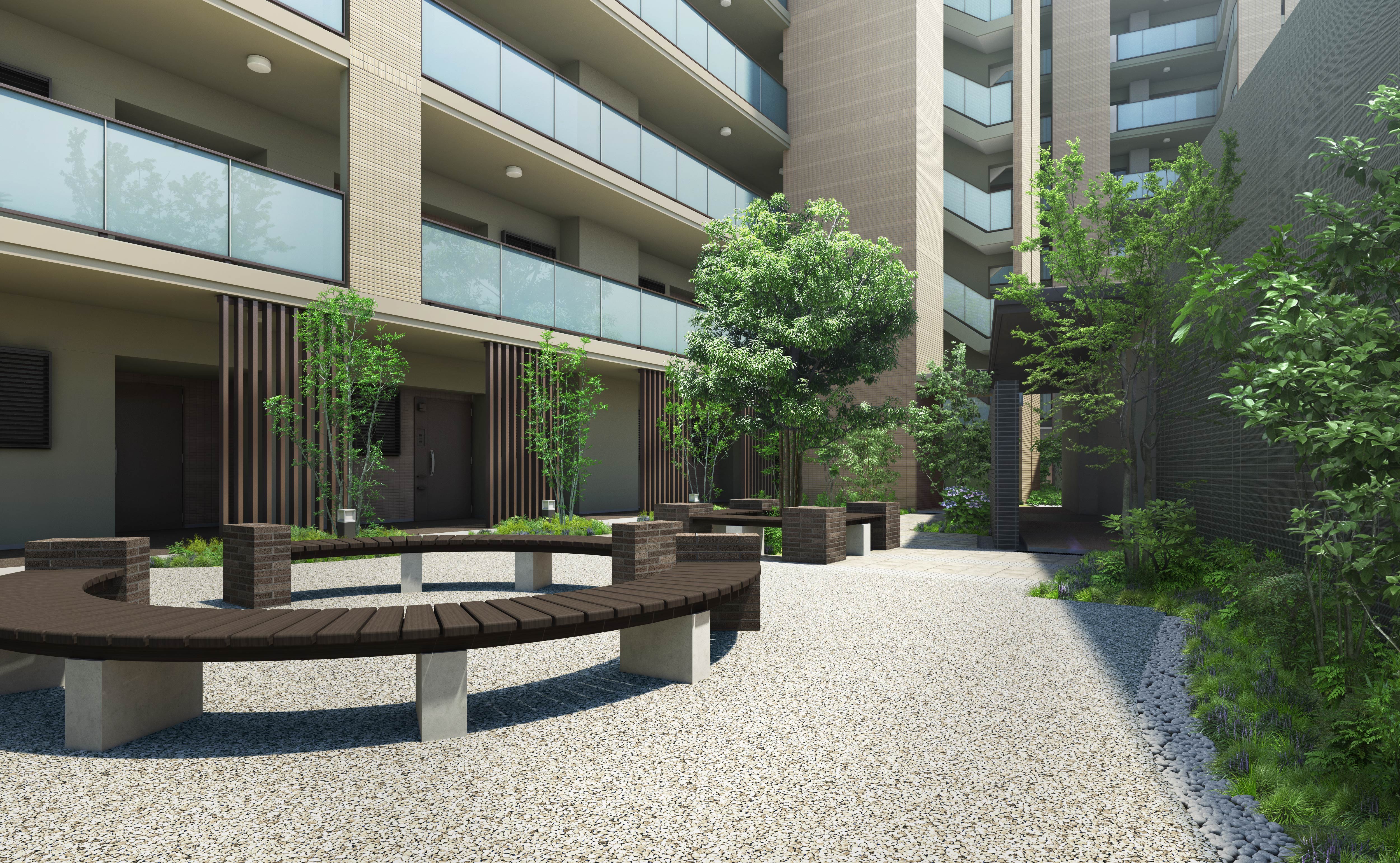 邸宅の顔となるエントランス周りには、自主管理公園と連なる豊かな緑景を創出。敷地全体にも邸宅のプライバシー性を高める自然な目隠しとしながら、街並みに潤いあふれる風景をプラス。樹種約50種、約350本もの植栽を計画。