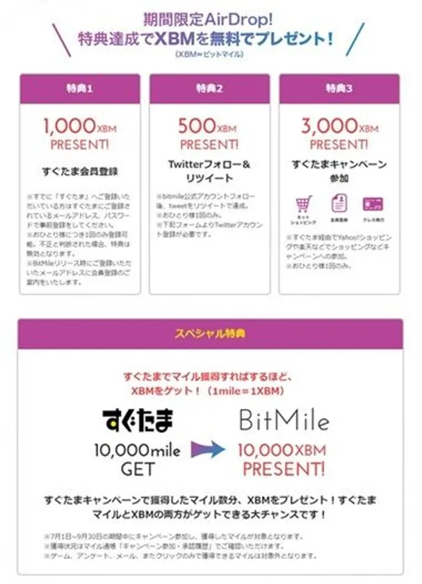 ビットマイル社は、XBMを無料配布することで、投資リスクを抑えた形で仮想通貨経済に参加できる機会を全すぐたまユーザーに提供します。