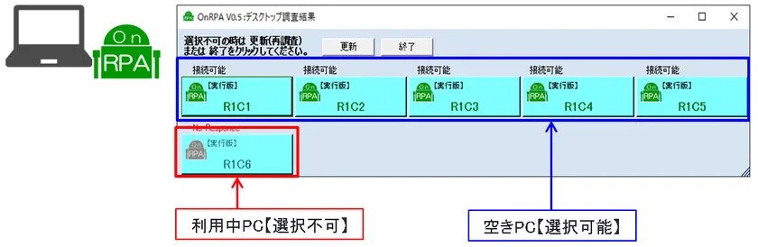 そこで開発したのが、「OnRPA(TM)」です。「OnRPA(TM)」は、専用PCの使用状況(空きPCまたは利用中PC)を表示し、空きPCのみに接続できるため、問題となるリモート接続時の後着優先問題を解決できます。
