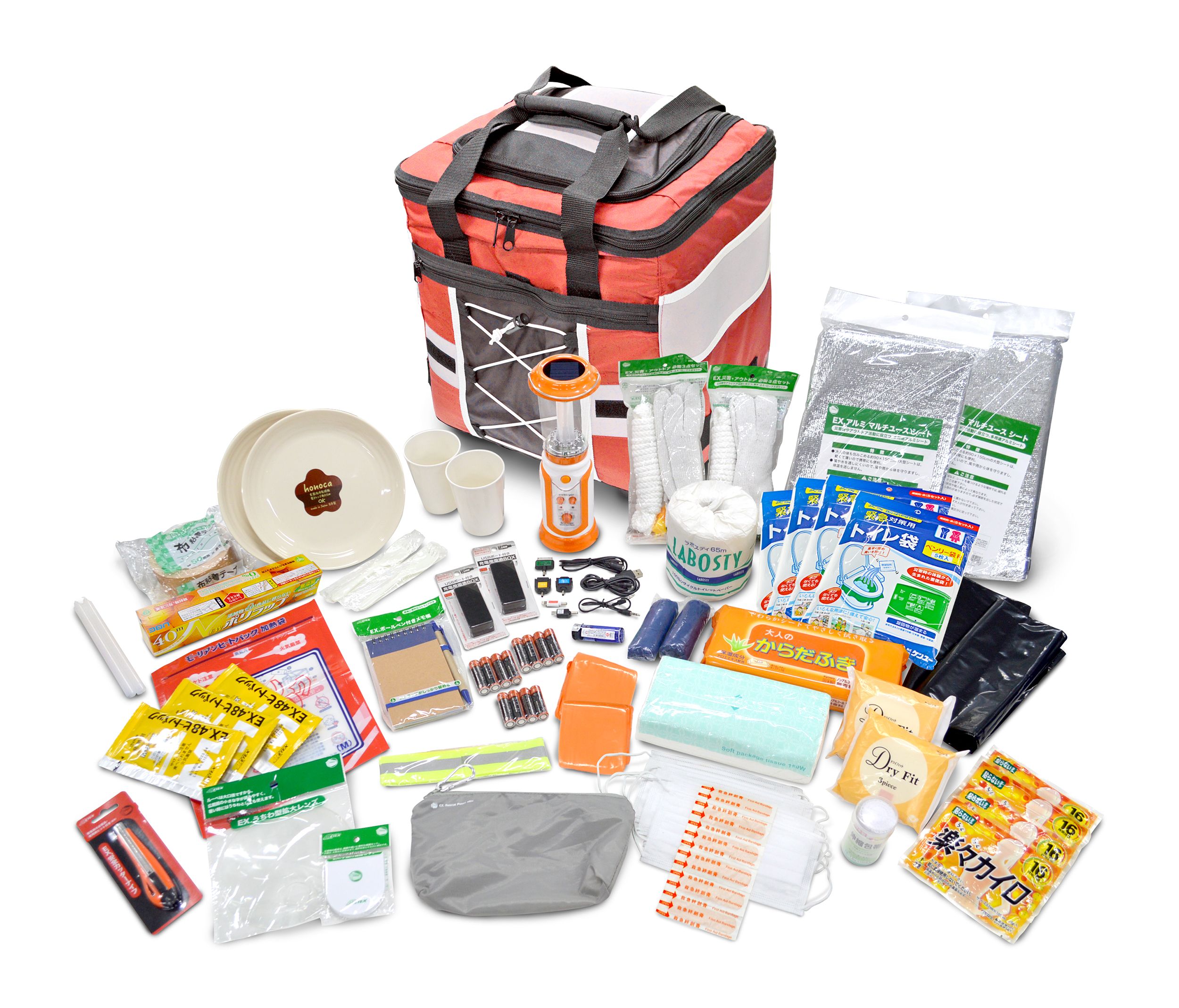 多機能ランタン、簡単トイレ袋、軍手、レインポンチョ、包帯など、いざという時の必需品34種を当社の防災士が厳選し、コンパクトに収納しました。
