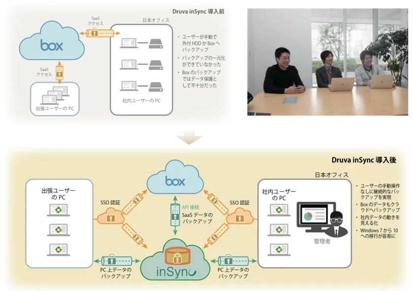 「BackStore by inSync」は、PCだけでなく全てのエンドポイントとBoxにも対応し、自動でバックアップを行うため、データ保護の課題を解決します。また、重複のないデータブロックのみをクラウドへ転送・保存するため、帯域とストレージを50%~90%削減し、バックアップの時間と手間の削減を実現、ADKアーツの抱える2つの課題を解決しました。