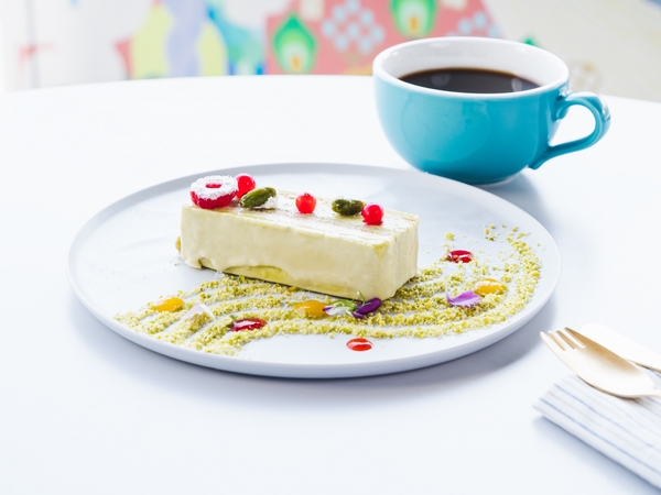 ピアノ設置期間の1か月限定で、旅するLovePianoオリジナルケーキを販売します。ピアノ越しに広がる緑豊かなガーデンエリアみやぐりんへ音楽が広がっていくイメージのもと、緑色をベースに仕上げ、トッピングでピアノの色彩の豊かさを表現しています。ピスタチオをふんだんに使用したバタークリームとオレンジ風味のクリーム、スポンジを重ね五線譜をイメージ。一口食べると口いっぱいにピスタチオとオレンジの香りが広がります。ピアノの音色に耳を傾けながら、ゆったりとカフェタイムを楽しむことができます。