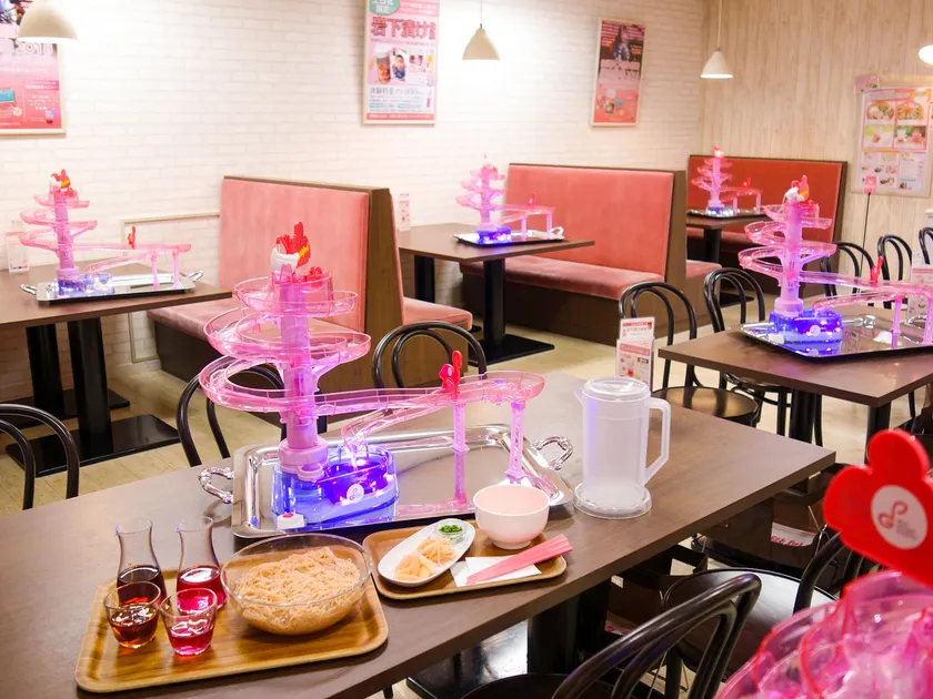 夏の風物詩とピンク色をモチーフに館内をデコレーション。館内随所で、花火など夏の風物詩やピンクにこだわった空間とアトラクションをお楽しみいただけます。館内カフェには『岩下の新生姜流しそうめん』など、期間限定の新メニューが登場します。