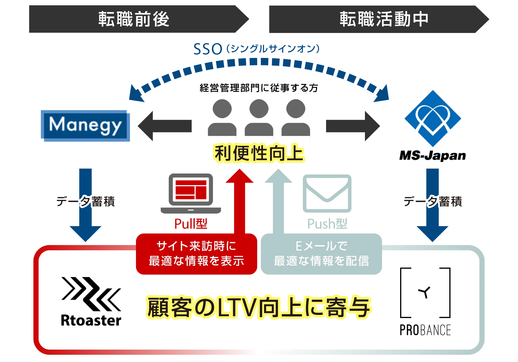 顧客体験向上のためには、顧客それぞれにマッチした情報の発信(パーソナライズ)が必要です。MS-Japanの施策においては、顧客の属性や行動に応じて、「Webサイト上でのPull型のコミュニケーション」を「Rtoaster」が担い、「おすすめ求人、記事などを送るPush型のコミュニケーション」を「Probance」がメール配信を通じて担っています。