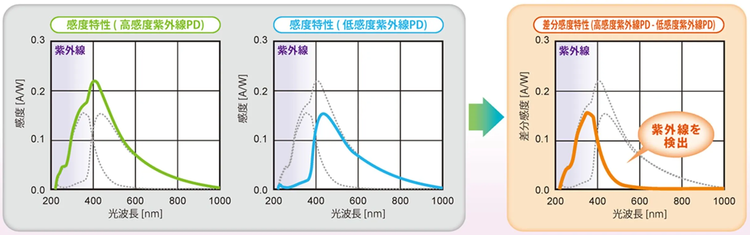 PDからの出力の差分を取り、可視光成分をカットすることで、フィルターレスでの紫外成分の検出が可能です。