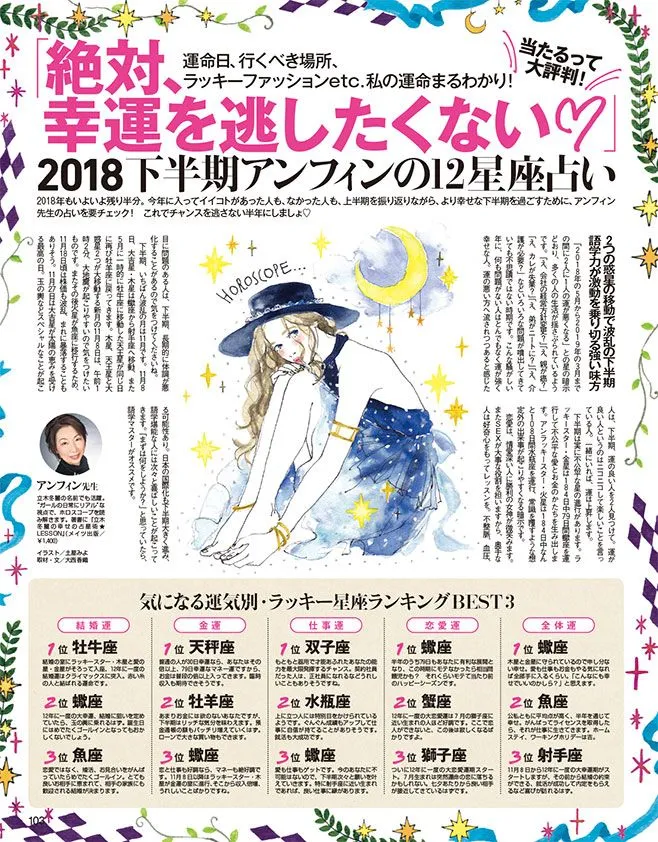 2018年もいよいよ残り半分。今年に入ってイイコトがあった人も、なかった人も、上半期を振り返りながら、より幸せな下半期を過ごすために、アンフィン先生の占いを要チェック!これでチャンスを逃さない半年にしましょ♪