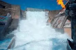 怒りの大爆発!高さ18mの巨大神殿から噴き出す大迫力の炎。赤く燃え上がり、熱風が吹き付けます。