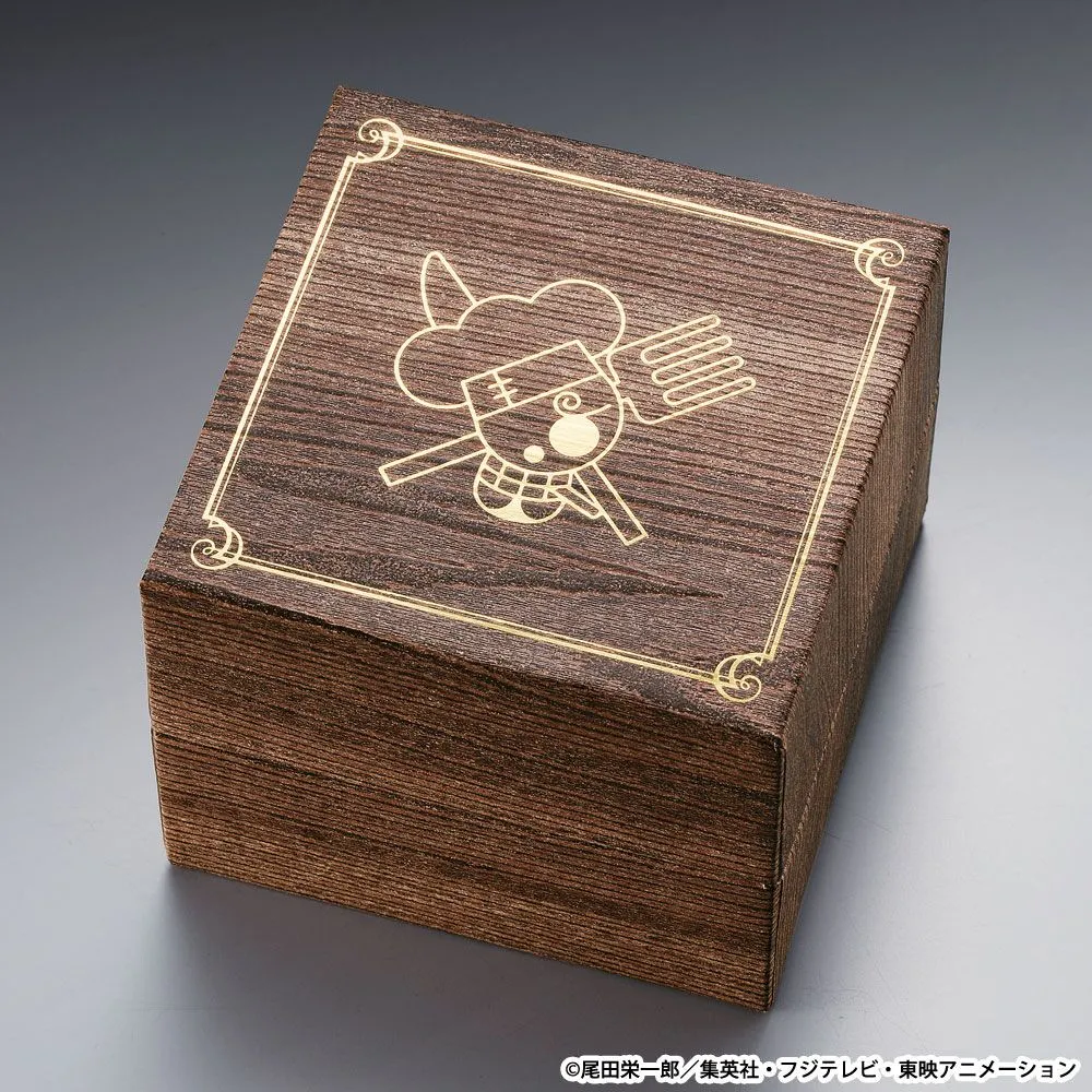 腕時計は世界限定999点。天面にサンジの海賊旗のマークをデザインした、木目調の特製ボックスに収めてお届けします。