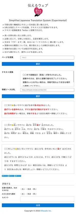 アルファサード株式会社(所在地:大阪府大阪市、代表取締役:野田 純生)は、災害情報や災害で避難中の人のうち、主に在留外国人や知的障害者への情報伝達に役立つとされる「やさしい日本語」での情報発信を支援するウェブサービスの提供を開始します( https://tsutaeru.cloud/ )。利用料金は無料。