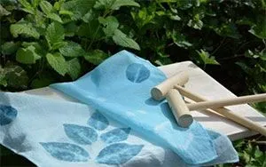 藍の葉っぱを使って、シルクのハンカチでたたき染めを行います。完成したハンカチは、世界に一つだけのオリジナルの一品に。