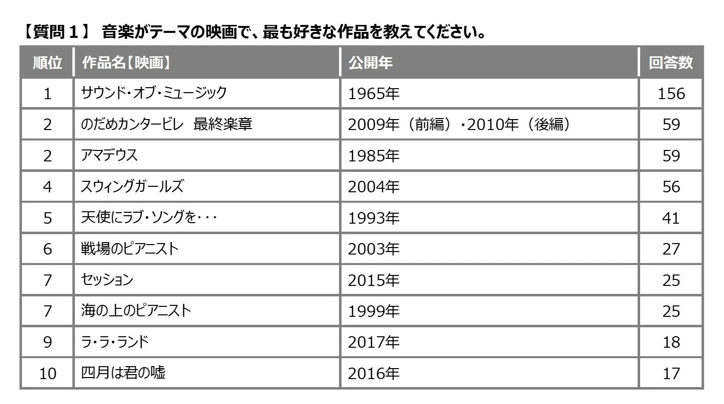 テレビCMや音楽の教科書でもおなじみの「ド・レ・ミの歌」「エーデルワイス」「私のお気に入り」などが登場する映画『サウンド・オブ・ミュージック』が1位でした。ほとんどの世代で1位となり、世代を超えて親しまれていることがわかります。次いで2位は、クラシック音楽の世界を描く映画『のだめカンタービレ 最終楽章』『アマデウス』でした。『のだめカンタービレ 最終楽章』は、女性の回答が8割を占める結果となりました。
