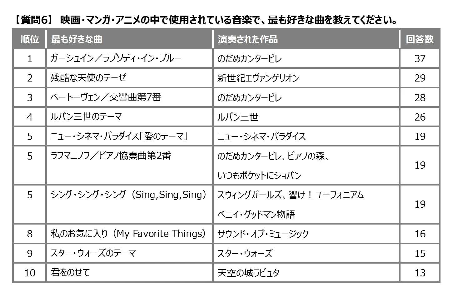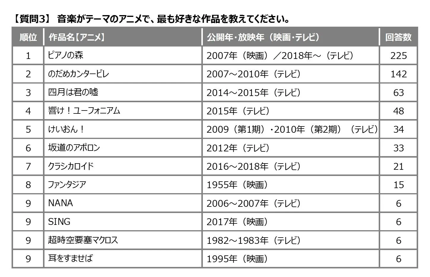 株式会社ヤマハミュージックジャパン(本社:東京都港区、代表取締役社長:押木正人)は、本年5月1日~23日、ヤマハミュージックメンバーズ*の会員を対象に、「音楽」がテーマの映画、マンガ、アニメ作品で好きな作品などを尋ねるウェブアンケートを行い、全国の987名から回答をいただきました。