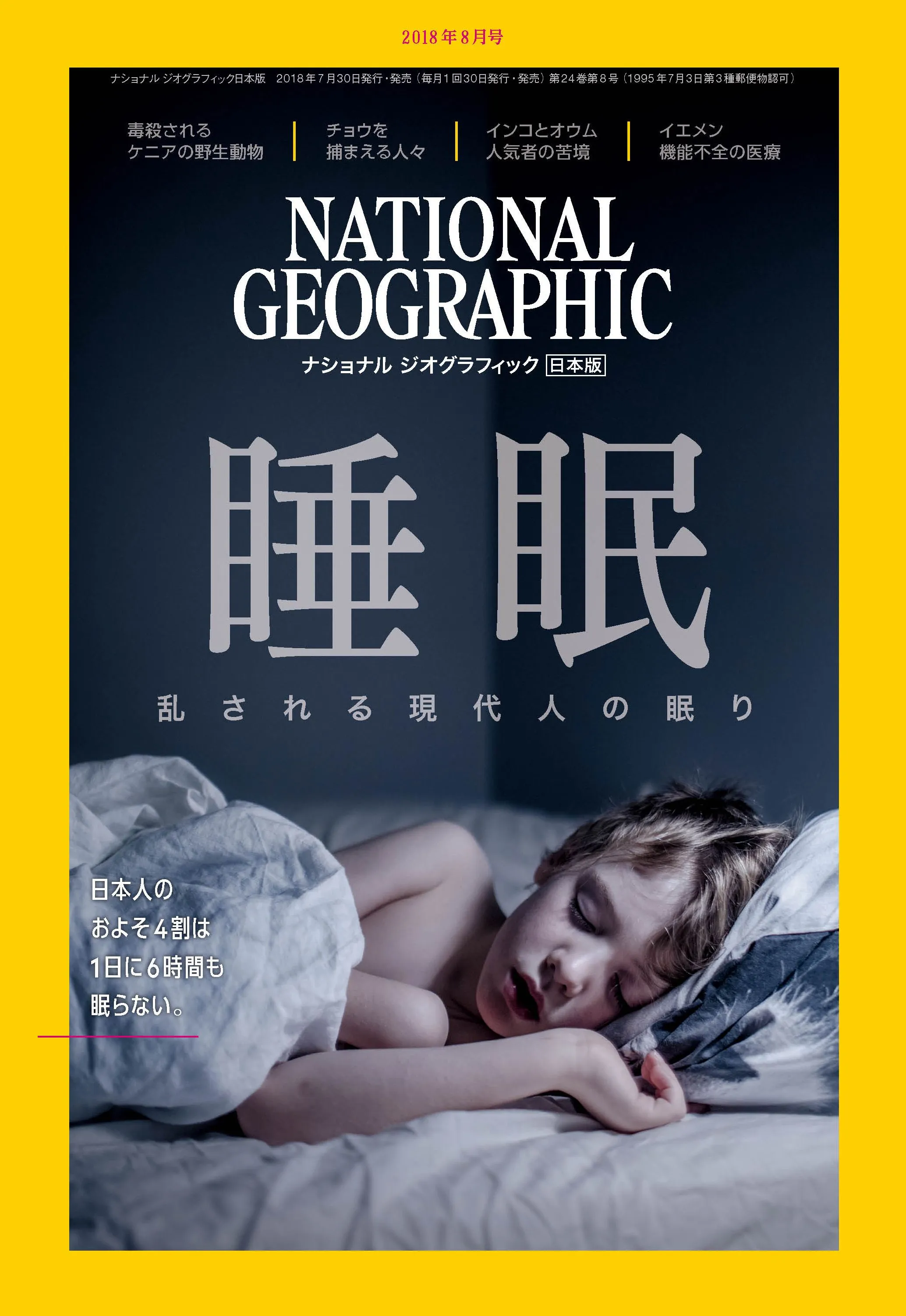 日経ナショナル ジオグラフィック社(代表:中村尚哉 、所在地:東京都港区虎ノ門)は、『ナショナル ジオグラフィック日本版2018年8月号』を7月30日(月)に発行します。今号の特集は、『私たちはなぜ眠るのか?ー睡眠が必要な本当の理由』『毒殺されるケニアの動物』『チョウを捕まえる人々』『イエメンの医療危機 ー行き場のない患者たち』シリーズ 鳥たちの地球から『インコとオウムの苦境』など全5本です。