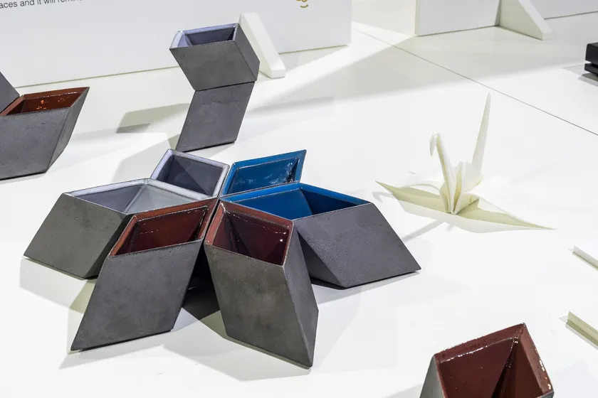 今回bud brandよりミラノデザインウィーク2018に出展したのは、菱形を組み合わせてデザインされた作品『菱』。愛知・三河の伝統工芸品「三州瓦」の素材と、鬼瓦の技術を用いて完成させたこれまでにない酒枡です。四辺の長さが同じで、どの角も直角でない菱形は、古来よりおめでたい形として用いられ、日本では家紋にも多用される馴染みの深い幾何学形です。祝福の想いが華やかに伝わる贈り物として、お祝いのシーンに添えられることを想定した作品となっています。