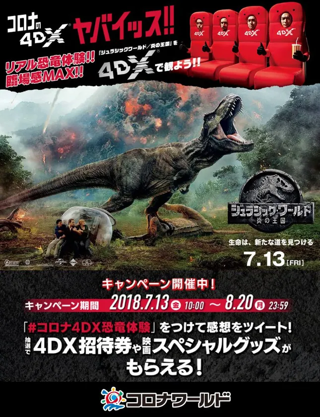 コロナワールドでは、同日7/13(金)より「ジュラシック・ワールド/炎の王国」4DX版を鑑賞して、映画の感想をTwitterで投稿すると、4DX映画鑑賞券やジュラシック・ワールドのオリジナルグッズが抽選で当たるキャンぺーンを実施いたします。