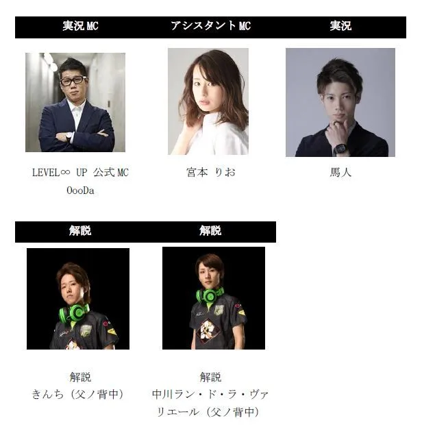 | 出演者 | LEVEL∞ UP 公式MC、実況: OooDa (Twitter: @OooDa) 実況:馬人(Twitter: @UMANCHU_729) 解説:父ノ背中 きんち(Twitter: @X_Edge_Rhapsody) 解説:父ノ背中 中川ラン・ド・ラ・ヴァリエール(Twitter:@QooLAmD) アシスタントMC:宮本 りお(Twitter: @rio_miyamoto) |