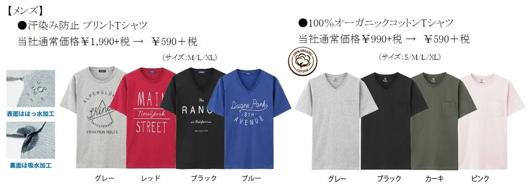 またメンズの夏のお悩み解決として、汗をかいても目立ちにくい「汗染み防止プリントTシャツ」もおすすめ。裏面は汗を吸収する吸水加工、表面ははっ水加工を施した2層構造。表面のはっ水加工が、裏面からの汗をはじくため、汗をかいても表面には染みになりにくく目立ちません。